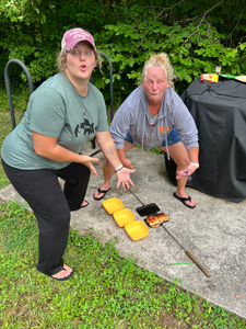 Once we got the kiddos back in some dry clothes at the house we started our bonfire so we could make our yummy pizza sandwiches over the fire! That last pic there is Nana and I being our usual goofy selves, haha - showing off our caveman food as we called it, being so proud we cooked it over the fire!